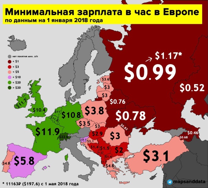 Telegram-канал Maps&Data опубликовал карту минимальных зарплат в пересчете на один час в странах Европы, в России, Казахстане и других государствах СНГ по состоянию на 1 января 2018 года.