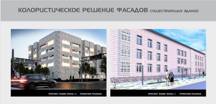 По данным экспертной группы, колористическое решение фасада здания по адресу: улица Кунаева, 51, неприемлемо, так как предлагает закраску естественного камня, которым отделано здание. В связи с этим рекомендовано сохранить существующую облицовку с восстановлением ее свойств.