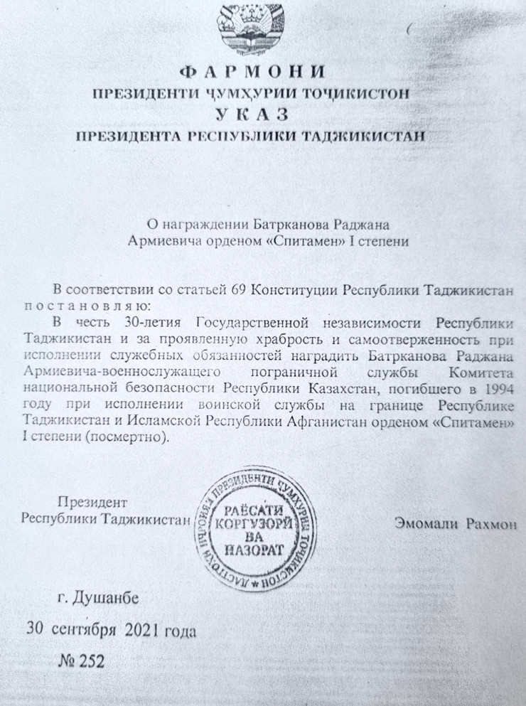 Президент Таджикистана Эмомали Рахмон наградил посмертно казахстанского военного, героически погибшего 27 лет назад на границе с Афганистаном. Раджана Батырханова (Батрканова) наградили орденом "Спитамен" первой степени, передает Tengrinews.kz со ссылкой на пресс-службу КНБ.