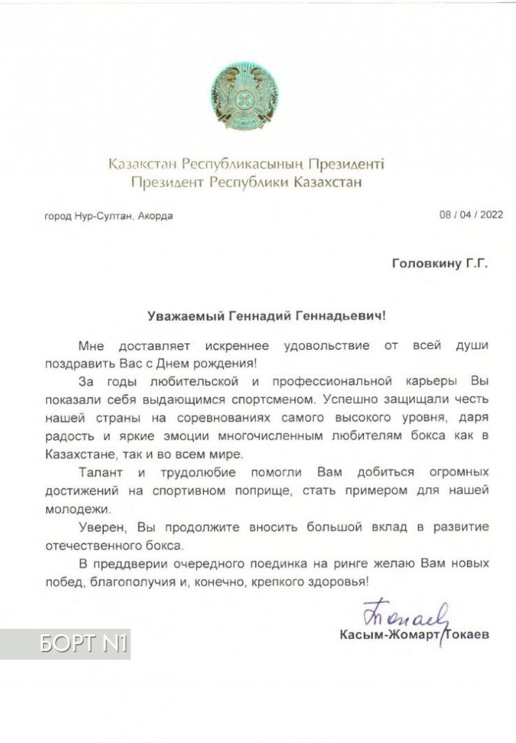 Президент Касым-Жомарт Токаев направил поздравительную телеграмму чемпиону мира по боксу Геннадию Головкину в связи его с днем рождения, передает Tengrinews.kz со ссылкой на пресс-службу Акорды.