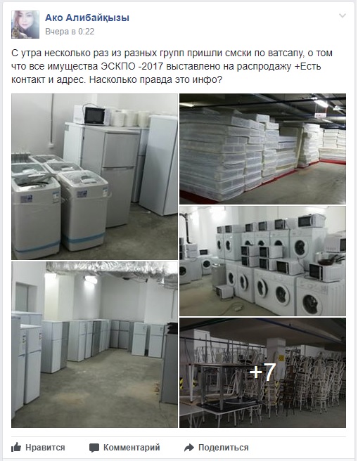 Отметим, в социальных сетях, в частности в группе Астана - Что? Где? Когда?, пользователи писали о получаемых сообщениях о распродаже имущества EXPO-2017.