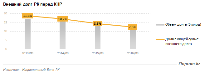 Обязательства Казахстана перед Китаем на конец сентября 2016 года сократились на 54 миллиона долларов или 2 процента. Обязательства по прямым инвестициям в данном секторе сократились на 72,3 миллиона долларов.