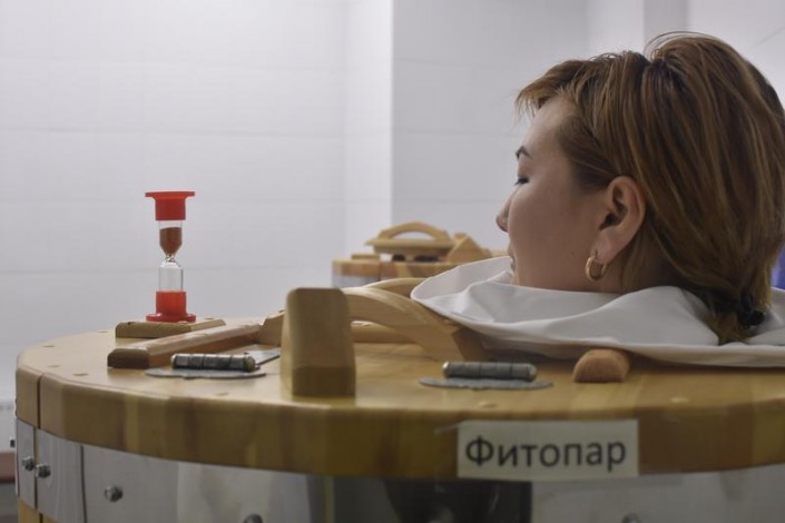 Медсестра Тендык Туякова охраняет покой клиента: в ее движениях - минимум шороха и шума. Тоненьким мягким голосом она перечисляет последовательность механизмов, происходящих внутри: капсула нагревается, пускает пар, увлажняет, массажирует и, конечно же, развлекает: "Там градом идет вода!" - реагирует Тендык Туякова, как только в капсуле начинается "тропический дождь".