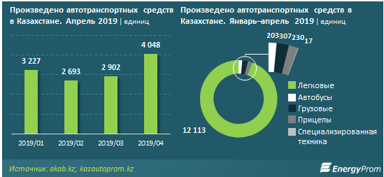 Объемы производства автотранспортных средств, трейлеров и полуприцепов в РК растут третий год подряд и в денежном выражении за январь-апрель 2019 года составили 83,9 миллиарда тенге. Индекс промышленного производства составил 145,8 процента по отношению к январю-апрелю 2018 года.