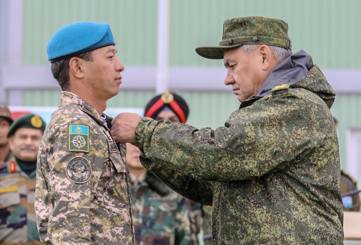 По итогам международных учений отличившихся военнослужащих наградили медалями.