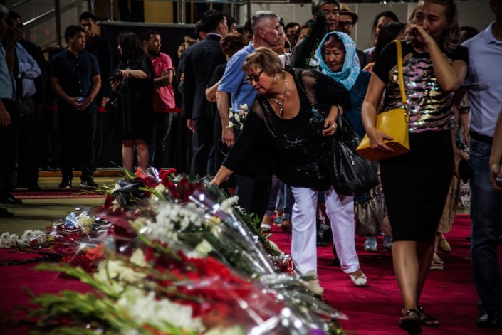 Около 10.00 открывают двери. На улице уже около 30 градусов. Медики на носилках уносят тех, кто упал в обморок от теплового удара. Очередь во Дворец спорта начинается от Центрального стадиона. Волонтеры делят желающих попасть внутрь на два потока. Внутрь пускают небольшими партиями. В соцсетях пишут, что некоторые за 2 часа так и не смогли пройти во дворец. Они повезли цветы к месту убийства Дениса на Курмангазы - Байсеитовой.