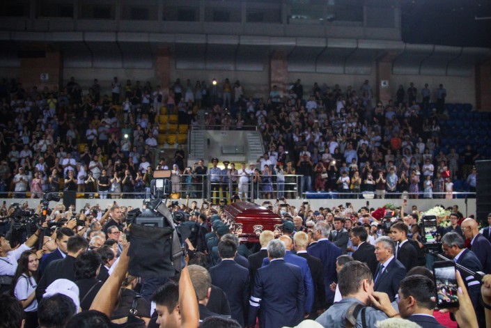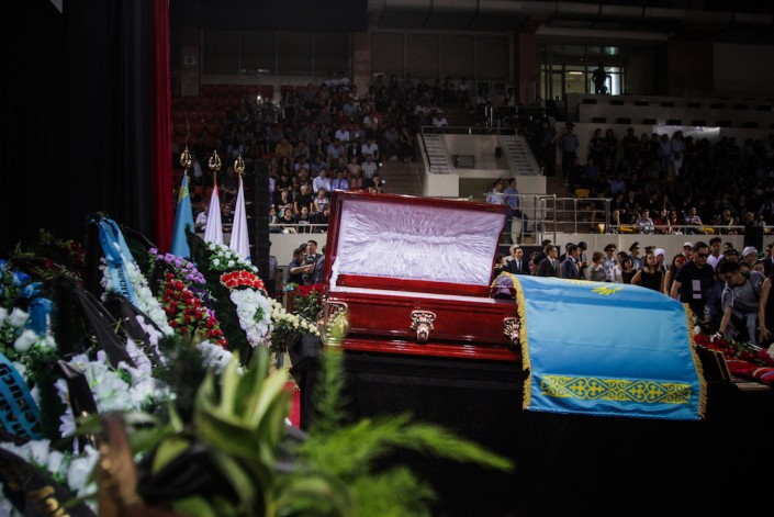 Говорит министр культуры и спорта Арыстанбек Мухамедиулы. Он зачитывает телеграмму от имени Нурсултана Назарбаева, которая ранее была передана родителям Дениса. Телеграмму от имени акима Алматы Бауыржана Байбека зачитывает его заместитель.