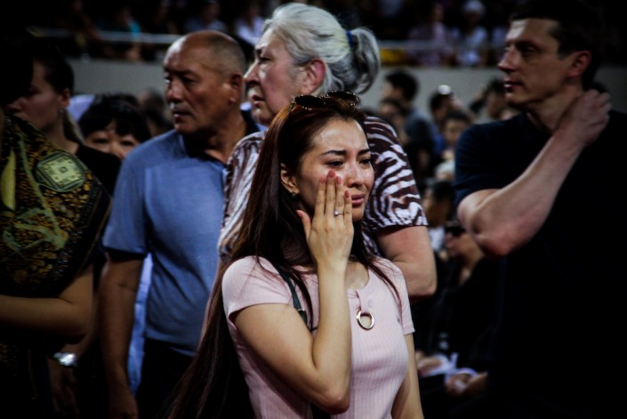 Люди несут цветы, венки с надписями "Денису от ...". Дети готовы подарить свои любимые игрушки. Молодежь прощается с помощью шаров с надписями и фотографий любимого спортсмена на футболках. Мужчины помогают старикам и женщинам. На проводы спортсмена приходят с грудными детьми - мы встречаем маму с 6-месячным ребенком. Приходят и пожилые - самой взрослой, кого мы встретили, - 80 лет. Бабушку зовут Бекжан. Через секунду после нашего общения толпа подхватит ее и занесет внутрь здания: "Я пришла ради Дениса. По родственникам так не переживала. Я плакать хочу, я - болельщик. Каждый раз, когда он уезжал на соревнования, я ему благословение мысленно давала".