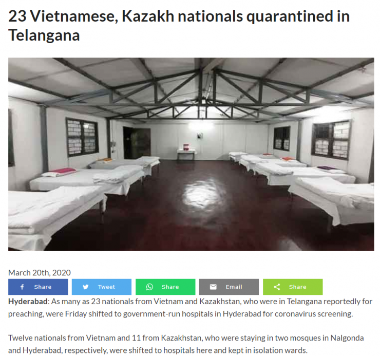 Новость опубликовало издание Siasat.com. По данным СМИ, граждане находились в двух мечетях в Налгонде и Хайдарабаде. Ранее группа из 10 проповедников из Индонезии были доставлены в больницу в Хайдарабаде. У восьми из них выявили коронавирус.