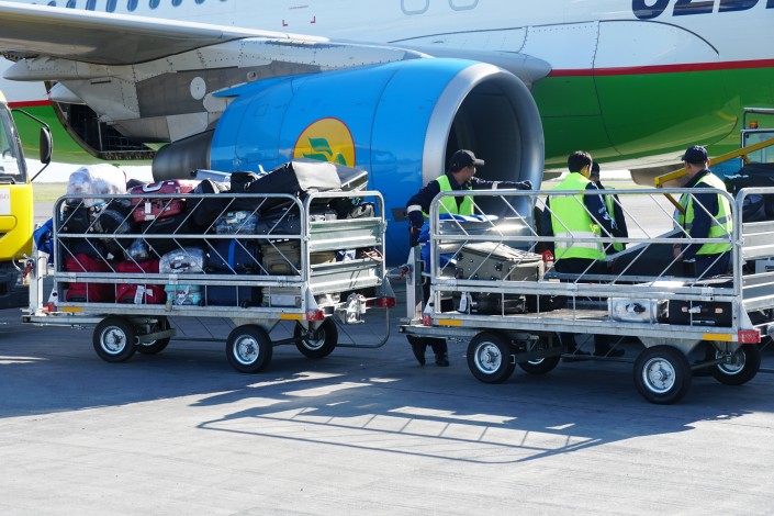 Багаж пассажиров, прибывших из Узбекистана, разгружают вручную, с помощью ленточного погрузчика: двое грузчиков выкладывают сумки из самолета на ленту, еще двое перекладывают их в тележки.