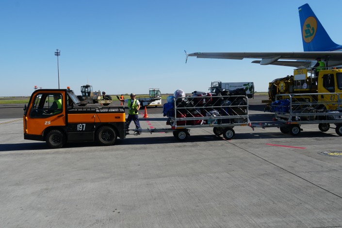 "Для международных рейсов мы определяем эту зону еще как пограничную, там работают пограничники, таможенные службы. Они контролируют, чтобы посторонние люди не имели возможности подойти к борту. Когда прилетает судно, в первую очередь устанавливаются колодки под колеса ВС, ставится телескопический трап для пассажиров. И одновременно с ним устанавливают либо ленточные перегружатели, либо контейнерные. Для небольших судов багаж перевозится в россыпь и его разгрузка из багажников осуществляется вручную грузчиками - на ленту выкладывается отдельно каждая сумка. Если борт большой, то багаж и груз перевозят в специальных средствах пакетирования - в самолетных контейнерах или паллетах (поддон для перевозки грузов)", - поясняет Светлана Ерошина.
