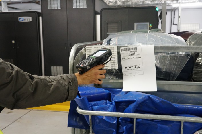 Сейчас в аэропорту тестируют новую систему сканирования багажа. Перед тем как отправить его на борт, оператор с помощью сканера считывает информацию с бирок. Они есть на каждом чемодане или сумке.