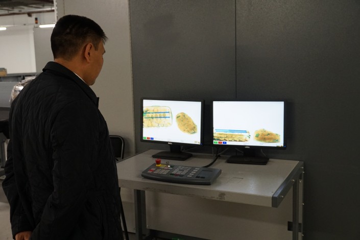Темные коричневые пятна на экране указывают, что хозяин чемодана положил внутрь что-то из продуктов питания. "Это печенье в сумке", - по своему опыту отмечает сотрудник таможенной службы.