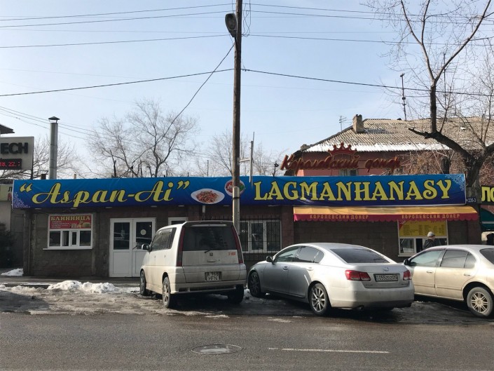 Вывеска лагманной на улице Тургута Озала выше проспекта Абая. Владельцы заведения отмечают, что вывеска на латинице появилась после того, как стало известно о переходе казахского алфавита на латиницу.