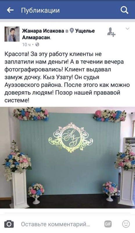Накануне пользователь Facebook Жанара Исакова опубликовала на своей странице пост о том, что клиент, выдавший замуж дочь, якобы не заплатил денег исполнителю организация торжества. Причем клиентом оказался судья Ауэзовского районного суда Алматы Максат Сейдахметов.