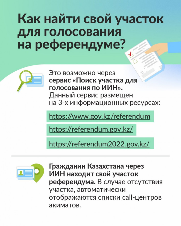 Найти свой участок для голосования на референдуме возможно через сервис "Поиск участка для голосования по ИИН". Данный сервис размещен на трех информационных ресурсах: