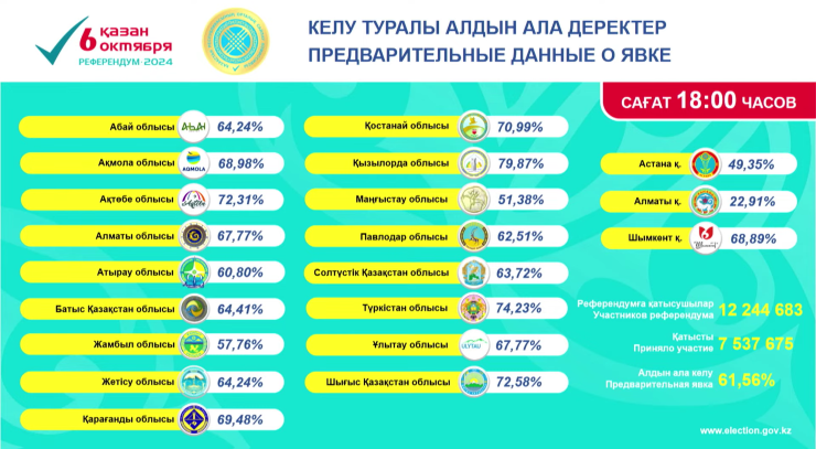 Референдум официально признан состоявшимся. На 14:00 предварительная явка в Казахстане составила 51,77 процента от общего количества граждан, включенных в списки. Референдум считается состоявшимся, если в нем примут участие более половины граждан с правом голоса.