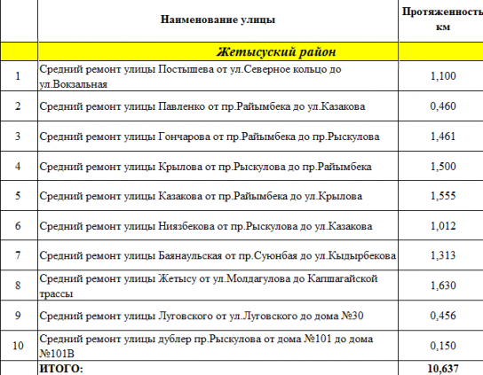 В Бостандыкском районе, наоборот, вместо изначально запланированных 20 улиц работы начали на 25. Ремонт все еще идет на шести улицах (в таблице они отмечены желтым цветом).