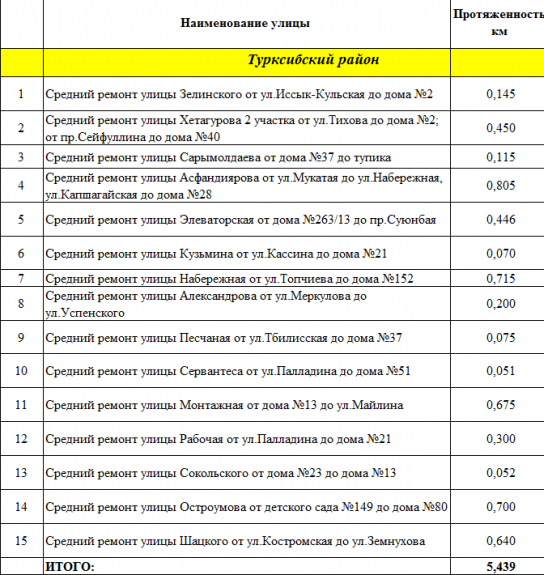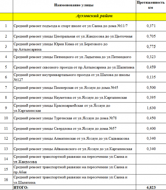 А вот в Ауэзовском районе ремонтировали 13 улиц вместо запланированных ранее 16. Ремонт так и не дошел до транспортных развязок на пересечении улиц Саина и Жандосова, улицы Саина и проспекта Абая, улиц Саина и Шаляпина. Кроме того, ремонт все еще идет на внутриквартальном проезде от улицы Шалова до школы № 127 и на улице Тургенская от улицы Яссауи до дома № 78.