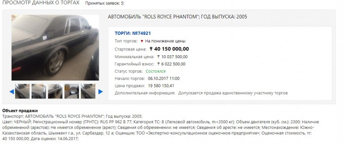 Rolls Royce Phantom осужденного бизнесмена Тохтара Тулешова продали на торгах, передает Tengrinews.kz. Торги состоялись 6 октября на электронной площадке на сайте gosreestr.kz.