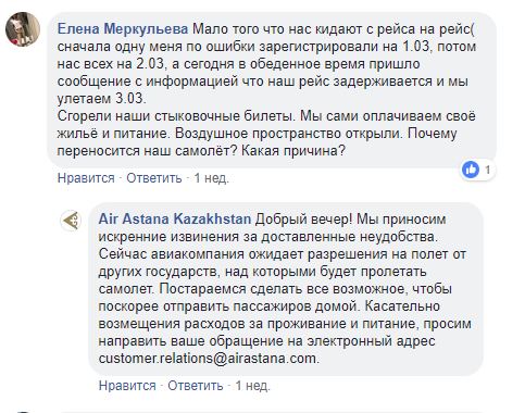 Вместе с тем Комитет гражданской авиации МИИР РК 28 февраля сообщал о рейсе Air Astana по маршруту Дели - Алматы следующее: "Ввиду форс-мажорных обстоятельств и отсутствия свободных гостиниц предоставление проживания пассажирам не представляется возможным".
