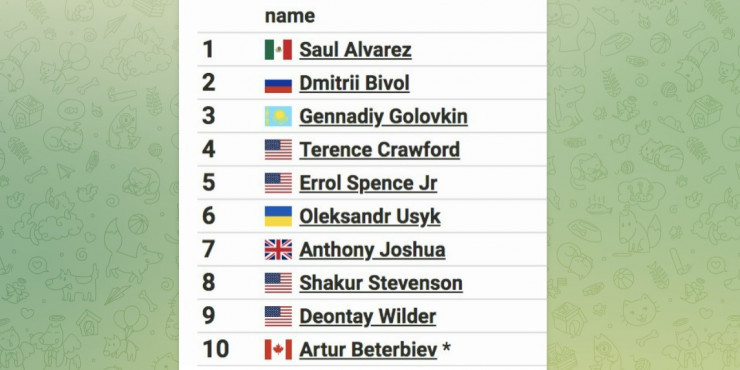 Как сообщает Telegram-канал "Ушатайка", российский боксер Дмитрий Бивол переместился с 17-й строчки на вторую и потеснил на ней Геннадия Головкина, который опустился на третье место. Первое место в  рейтинге продолжает занимать мексиканец Сауль Канело Альварес.
