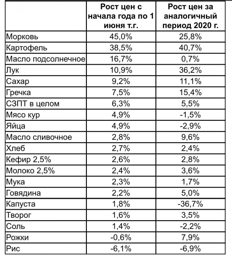 По информации ведомства, с начала текущего года среди всех товаров больше всего подорожали: морковь - на 45,0 процента, картофель - на 38,5 процента, масло подсолнечное - на 16,7 процента, лук - на 10,9 процента, сахар - на 9,2 процента, крупа гречневая - на 7,5 процента.