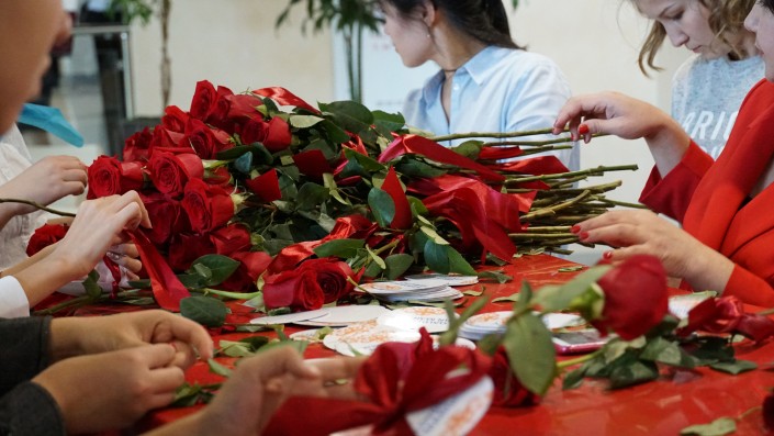 Цветы готовили тут же. Свежие охапки роз сортировали недалеко от входа, где шустрые девушки крепили к стеблям бирки с поздравлением.