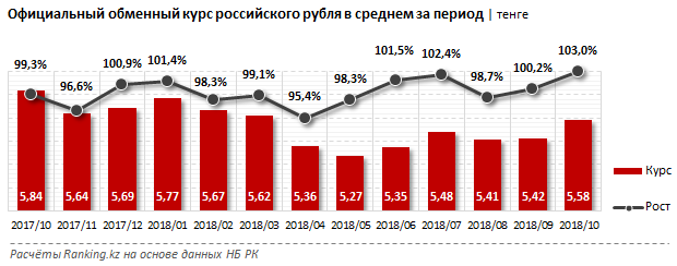 Официальный обменный курс российского рубля в среднем за октябрь составил 5,58 тенге за 1 рубль, что на 3 процента больше, чем в прошлом месяце, передает корреспондент Tengrinews.kz со ссылкой на Ranking.kz.