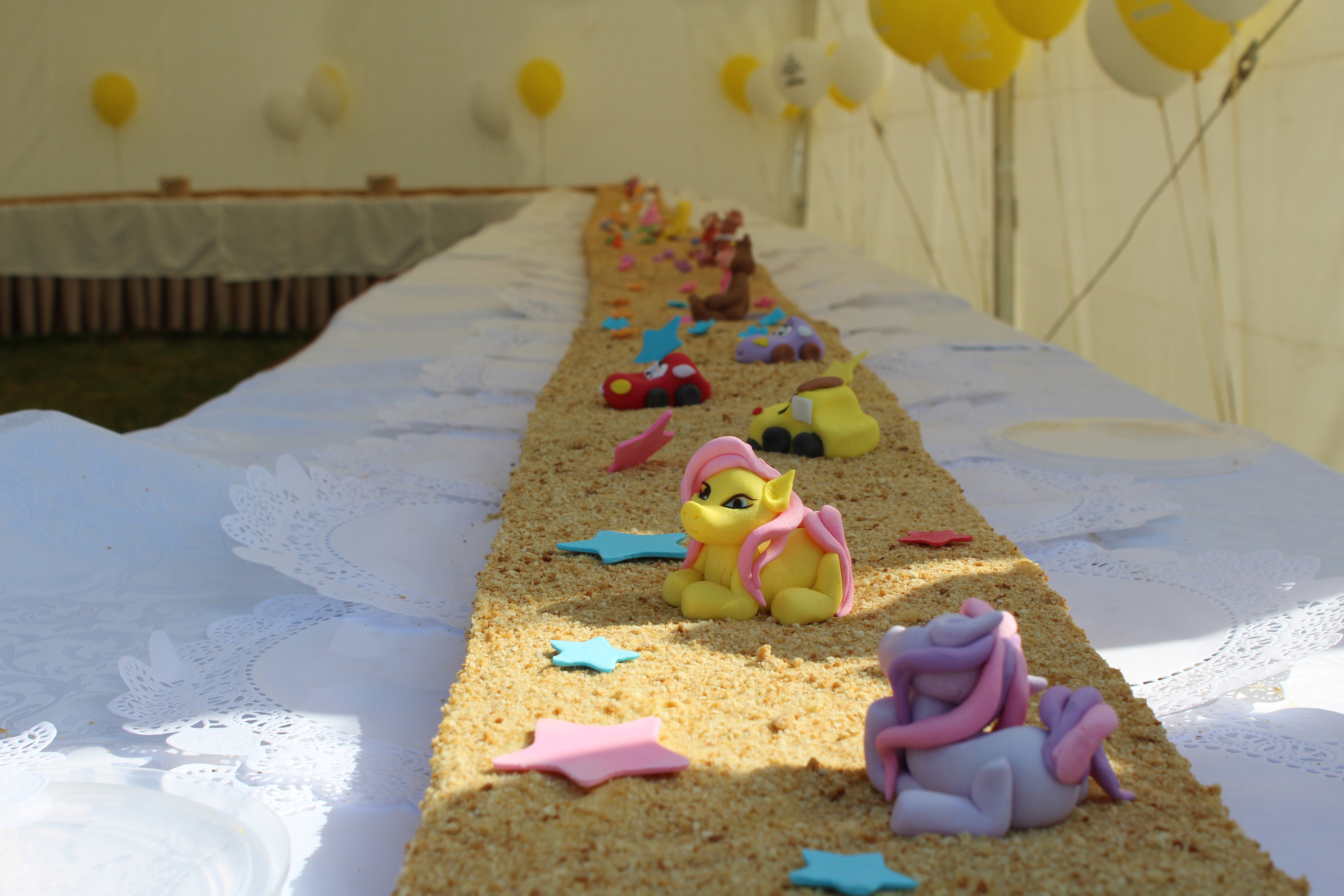 Для того, чтобы угостить всех детей тортом, организаторы праздника установили большой шатер. 30-метровый медовик весом в 225 килограммов готовили всего два кулинара столичного кондитерского цеха. Всю минувшую ночь мастера выпекали коржи: ушло 40 килограммов муки, более 500 яиц, 25 килограммов сахара и пять килограммов меда. Для оформления торта было сделано 60 фигурок сказочных персонажей из цветного сахара.