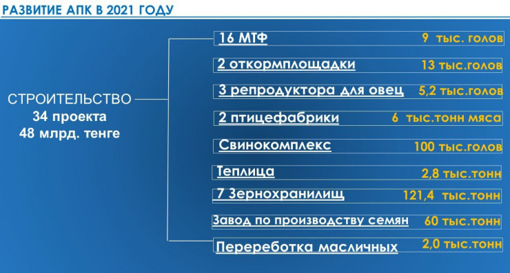 Кроме того, в регионе ведется строительство 16 молочно-товарных ферм на 9 тысяч голов, двух откормочных площадок на 13 тысяч мест, трех племрепродукторов по овцеводству, двух птицефабрик на 6 тысяч тонн, теплицы на 2,8 тысячи тонн и семи зернохранилищ на 121,4 тысячи тонн.