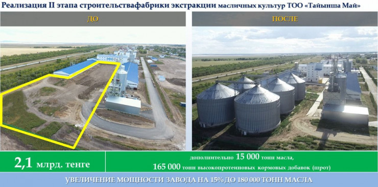 В 2016 году китайским инвестором запущен один из крупных проектов по переработке масличных в республике ТОО "Тайынша Май". Объем инвестиций на первом этапе составил 6,1 миллиарда тенге. Этим летом завершено строительство фабрики экстракции. Также на предприятии планируется открыть мясокомбинат, откормплощадку, реализовать проект по возобновляемым источникам электроэнергии.
