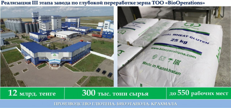 На заводе ТОО "BioOperations" реализуется производство муки, крахмала и глютена. В текущем году запущен третий этап реализации проекта - производство биоэтанола - продукта глубокой переработки зерна. При выходе на полную мощность заводом планируется выпускать до 21,5 тысячи тонн биоэтанола в год.