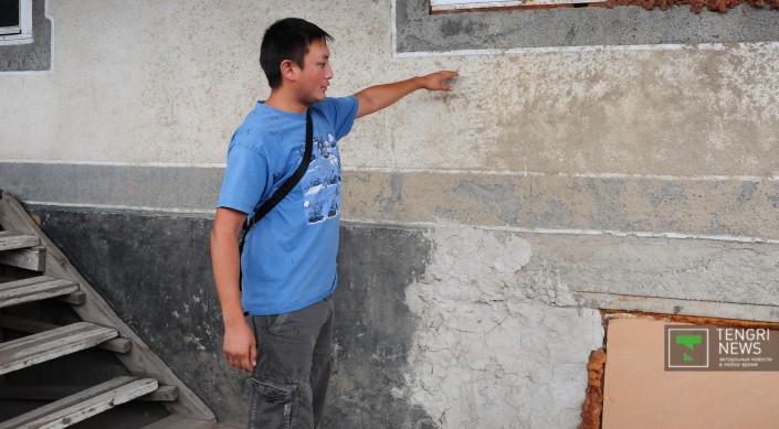 Рустам Мамыров показывает отметку, по которую его дом был затоплен грязевой массой.