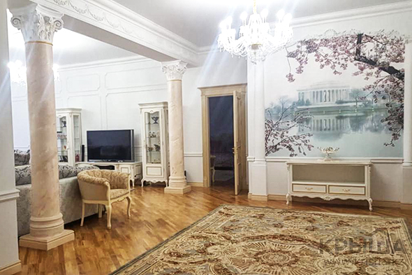 Пятое место заняла 4-комнатная квартира площадью 275 квадратных метров за 1,8 миллиона тенге в месяц. Апартаменты расположены на третьем этаже пятиэтажного ЖК "Жарык" в Нур-Султане в монолитном доме 2016 года постройки. Здесь три спальные комнаты с гардеробными и санузлами, гостиная, кухня, большой холл. Сдается с мебелью и бытовой техникой.