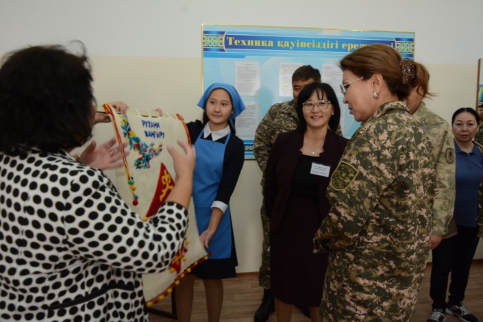 В частности, спецшколу посетили председатель комитета по международным отношениям, обороне и безопасности Сената Дарига Назарбаева, сенаторы Дархан Калетаев, Тулеубек Мукашев и аким Мангистауской области Ералы Тугжанов. Они прибыли на встречу в камуфляжной форме.