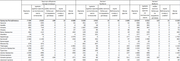 Из 13 024 взрослых старше 16 лет, покинувших Казахстан, на постоянное место жительство уехали 6 552 человека, 123 - по трудовому договору, 21 человек - в связи с учебой, другое - 326.