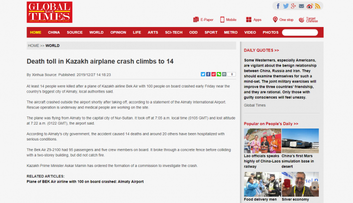 Жаһан жаңалықтарын жазатын қытайлық Global Times газеті "Қазақ ұшағының құлауынан қаза тапқандар саны 14-ке жетті" деген тақырыппен ақпарат берген.