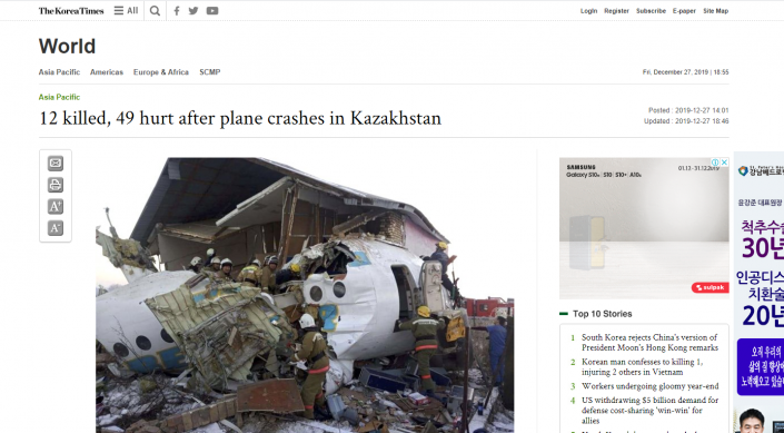 Оңтүстік Кореядағы ағылшын тілінде жазатын ең ескі газеттердің бірі The Korea Times өз сайтында бүгінгі апат туралы жазған. "Қазақстандағы әуе апатынан қаза тапқан - 12, зардап шеккендер - 49"деген тақырыппен шыққан материалда оқиғаның мән-жайы баяндалған.