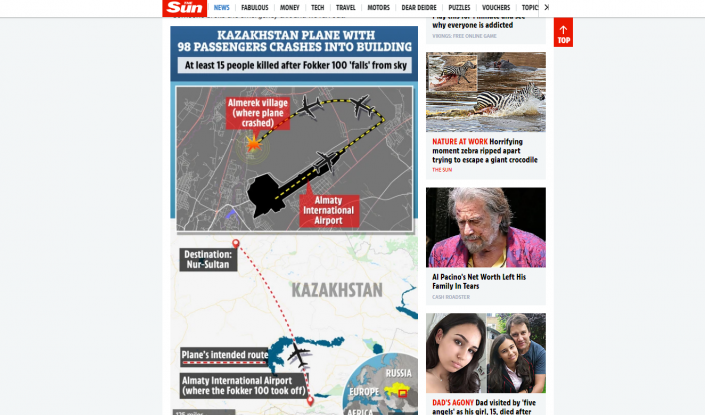 Басылым ұшақтың Алматыдан Нұр-Сұлтанға ұшу бағыты мен оның құлаған сәтін картаға түсіріп көрсеткен.