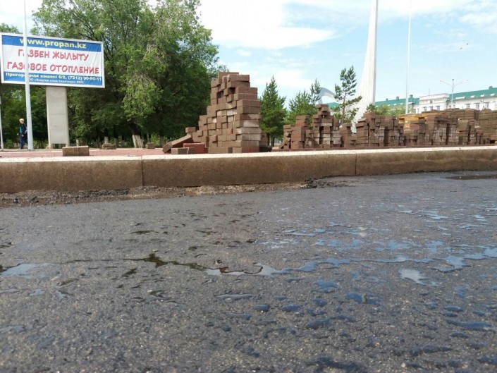 Видео в сети разместил пользователь под именем Данияр Еникей. Он подписал кадры словами: "В Караганде кладут асфальт несмотря на дождь". На кадрах запечатлена техника, которая раскатывает асфальт в дождь. Над асфальтом вьется пар. Корреспондент Tengrinews.kz побывал на площади Гагарина, которая сейчас перекрыта из-за ремонта. Здесь множество спецтехники, укладка асфальта уже не производится. Идет дождь. Асфальт очень теплый, немного рыхлый и подошва обуви слегка прилипает к нему.