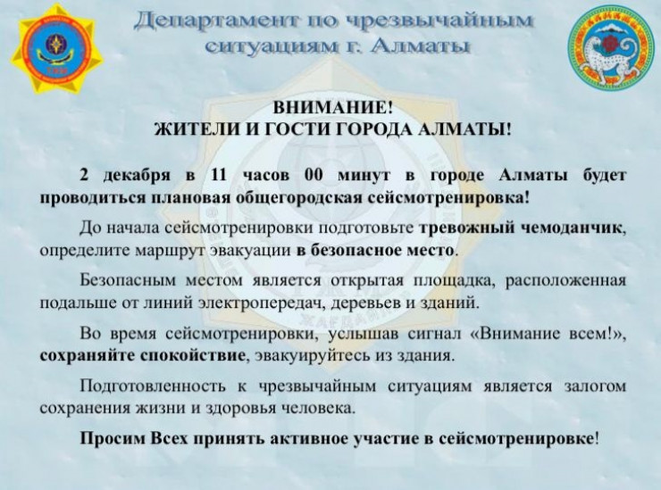 Как сообщил во время брифинга в акимате Алматы исполняющий обязанности начальника ДЧС города Ерлан Алибеков, плановая общегородская сейсмотренировка пройдет в эту пятницу, 2 декабря, в 11:00. В день тренировки по всему городу прозвучат сирены системы оповещения, будет осуществлен перехват теле-, радиоканалов, а также будет рассылка Push-уведомлений через мобильное приложение Darmen.