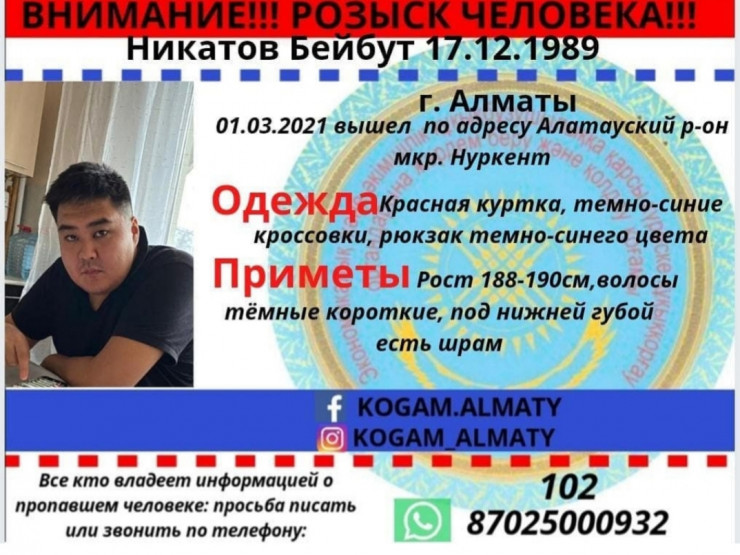 В Алматы шестые сутки ищут пропавшего без вести 31-летнего Бейбута Никатова, передает Tengrinews.kz.
