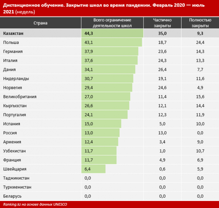 Если говорить о странах Европы, то долгосрочное закрытие школ наблюдалось, к примеру, в Польше (10 месяцев и 3 недели) и Германии (9,5 месяца). Однако казахстанские школьники были на дистанционке даже дольше европейских.