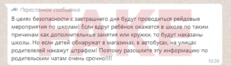 "В целях безопасности с завтрашнего дня будут проводиться рейдовые мероприятия по школам! Если вдруг ребенок окажется в школе по таким причинам, как дополнительные занятия или кружки, то будут наказаны школы. Но если детей обнаружат в магазинах, в автобусах, на улицах, родителей накажут штрафом", - сообщается в рассылке в WhatsApp.