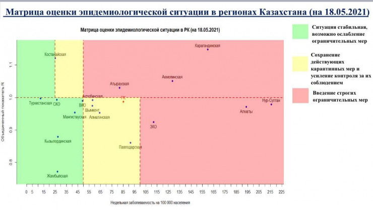 В "зеленой" зоне - Восточно-Казахстанская, Жамбылская, Мангистауская, Туркестанская, Кызылординская и Северо-Казахстанская области.