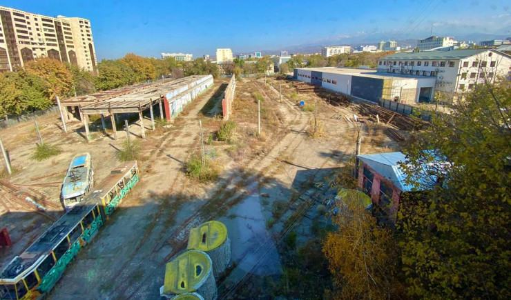 Вся территория трамвайного депо. Справа на фотографии расположено четырехэтажное здание, на месте которого планируют построить гостиницу. Фото: Шокан Алхабаев