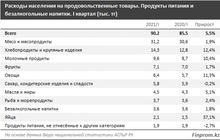 В первом квартале 2021 года расходы казахстанцев на продовольственные товары составили 96,7 тысячи тенге на душу населения - на 4,6 процента больше в стоимостном выражении, чем годом ранее.