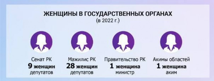 Также приводятся данные о том, сколько женщин Казахстана состоят на высших государственных должностях. Так, в Мажилисе насчитывается 28 женщин-депутатов, а в Сенате - 9.