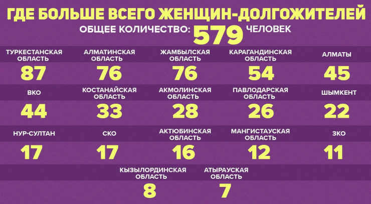 Больше всего долгожительниц зарегистрировано в южных регионах Казахстана. Так, на первом месте расположилась Туркестанская область, на чью долю приходится 87 человек. В тройке лидеров также Алматинская и Жамбылская области, здесь числится по 76 долгожительниц.